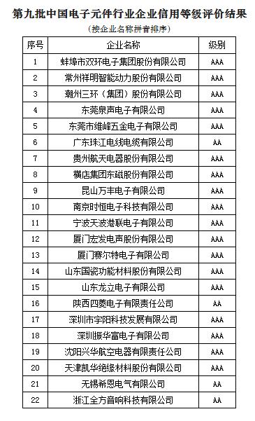 第九批中国电子元件行业企业信用等级评价出炉